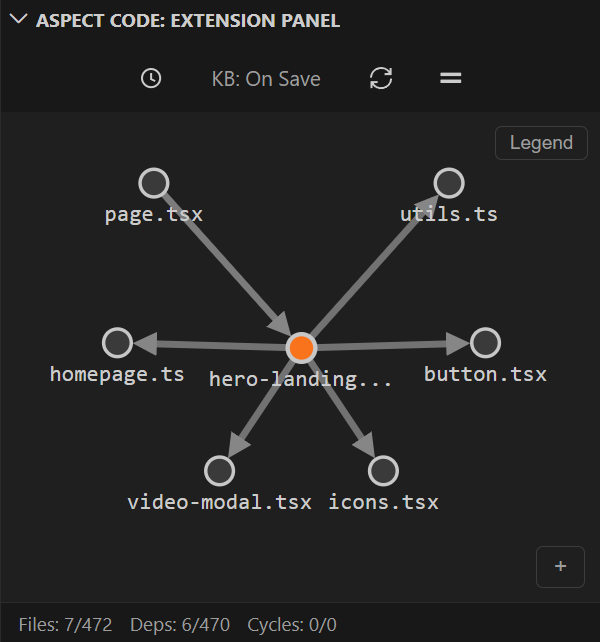 Files: 7/472 — 7 files shown in current view out of 472 totalDeps: 6/470 — 6 dependencies shown out of 470 totalCycles: 0/0 — No circular dependencies detectedFiles with many incoming connections are hub modules—changes to these affect many other files.